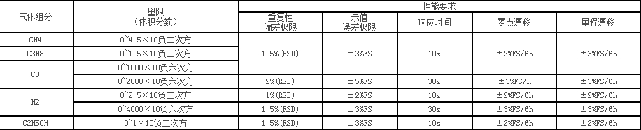 (1)檢驗(yàn)有濃度顯示的探測(cè)器應(yīng)有5種濃度標(biāo)準(zhǔn)氣,即10%FS、30%FS、50%FS、75%FS、90%FS;表2.1 氣體探測(cè)器專用檢驗(yàn)設(shè)備性能要求